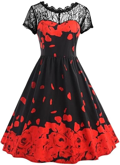 OHQ Robe à Manches Courtes en Dentelle ImpriméE pour Femme Rouge ...