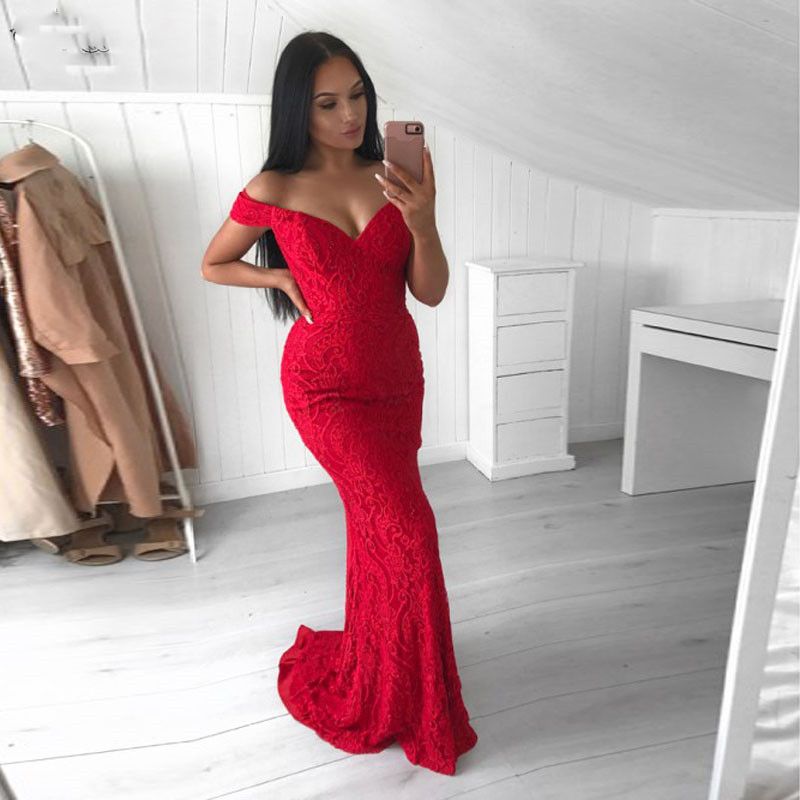 Acheter Rouge Dentelle Sirène De Bal Robes Hors Épaule Fermeture À ...